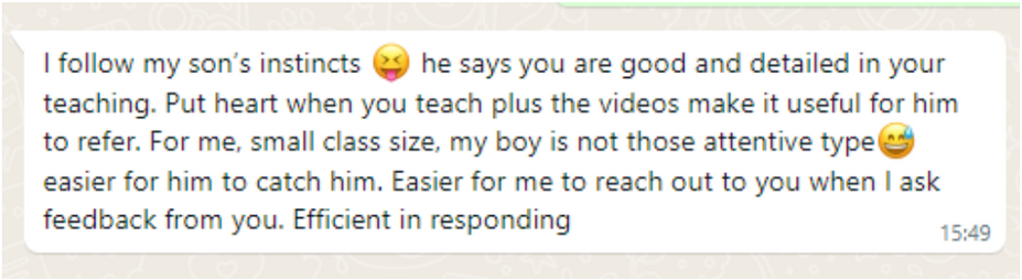I am able to understand the topics taught in class better. I am getting better and stronger in algebra which I was originally weak at. My math scores are getting better as I am able to understand your teaching clearly and I have a lot of practice during-tuition.