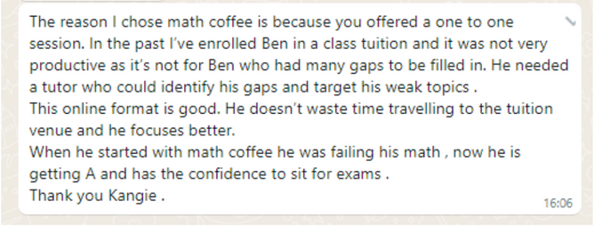 This tuition has helped me alot as I have always been weak at math and failing it. After I attended this tuition, my marks eventually improved and during my final year exam, Teacher Kangie helped to brush up my basics and I managed to get an A for maths!